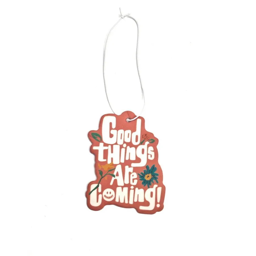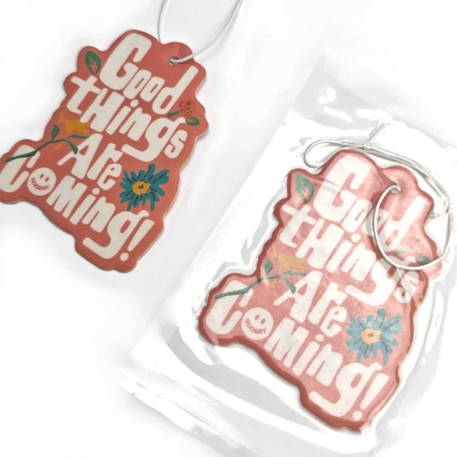這款香氛掛片以品牌經典標語 「Good things are coming!」 為主軸,使用溫暖的手繪字體,搭配花朵與微笑小圖案, 整體呈現充滿復古感與樂觀能量的視覺風格。
