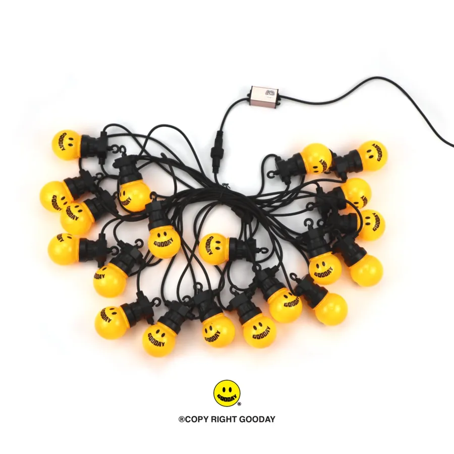 每一顆燈泡都印上 GOODAY 經典微笑標誌,搭配溫暖黃光,白天是療癒擺設, 夜晚一亮立刻變成最有情緒的氛圍燈。