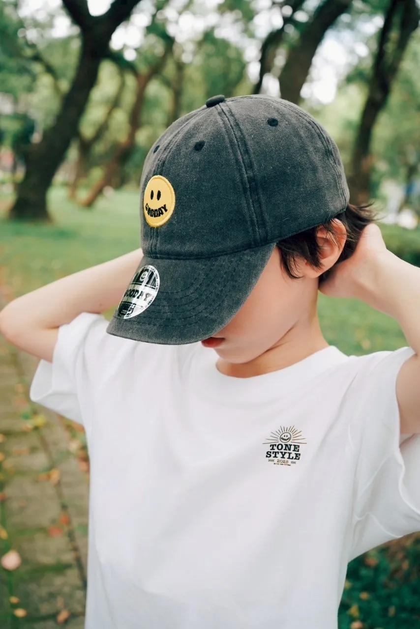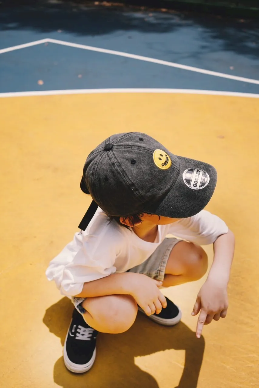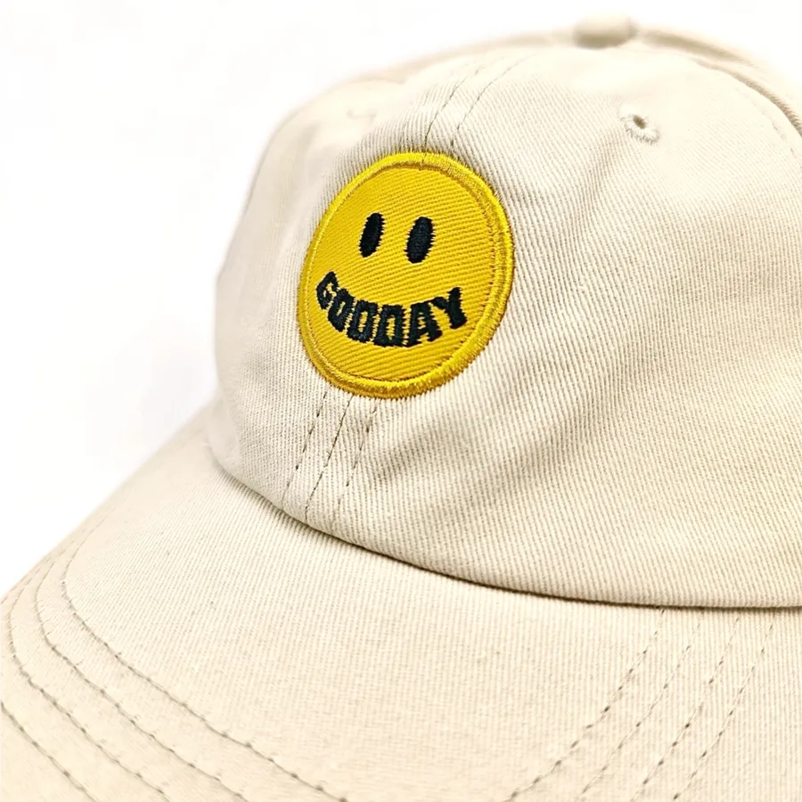 正面經典笑臉刺繡搭配 “GOODAY” 字樣,延續品牌的樂觀氛圍,讓孩子每天都能戴上好心情。