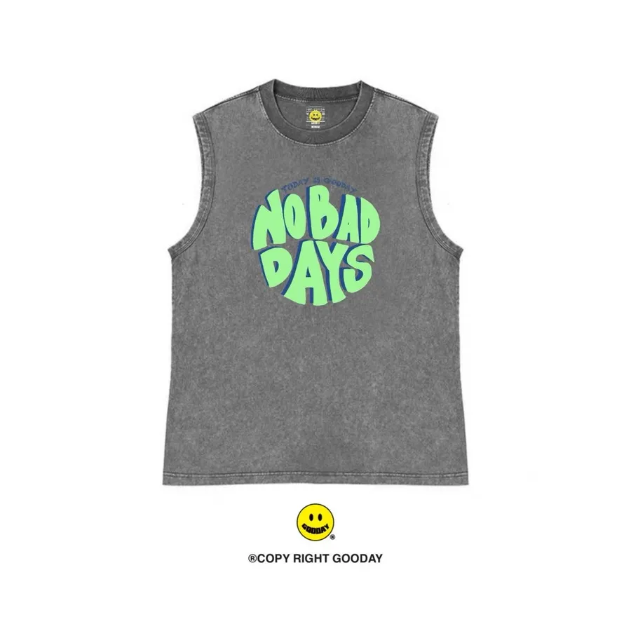 延續品牌經典標語「NO BAD DAYS」,這款背心以俐落的無袖版型搭配復古水洗質感,大面積的泡泡字設計展現強烈個性,同時傳遞 GOODAY 一貫的「保持微笑、沒有壞日子」精神。