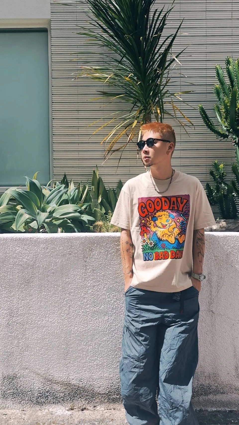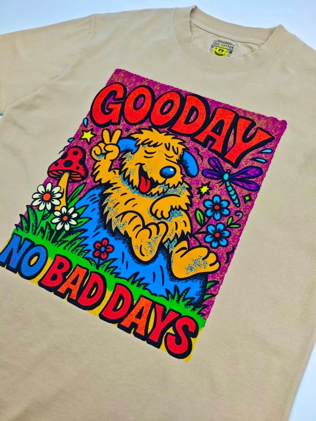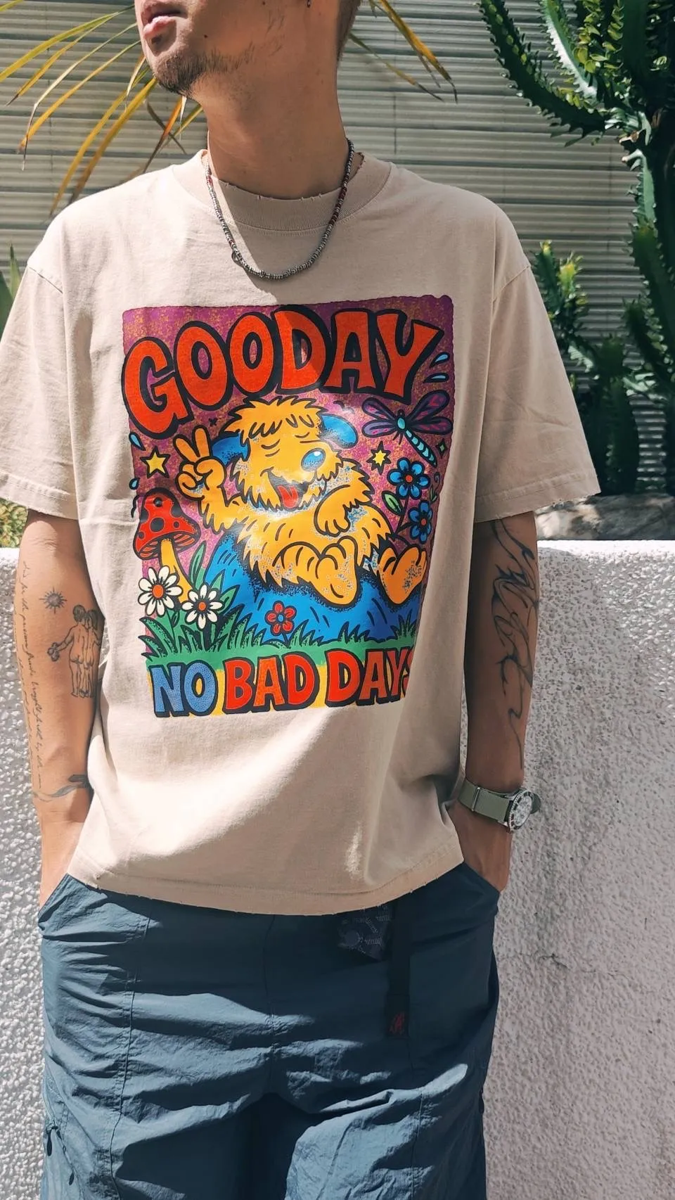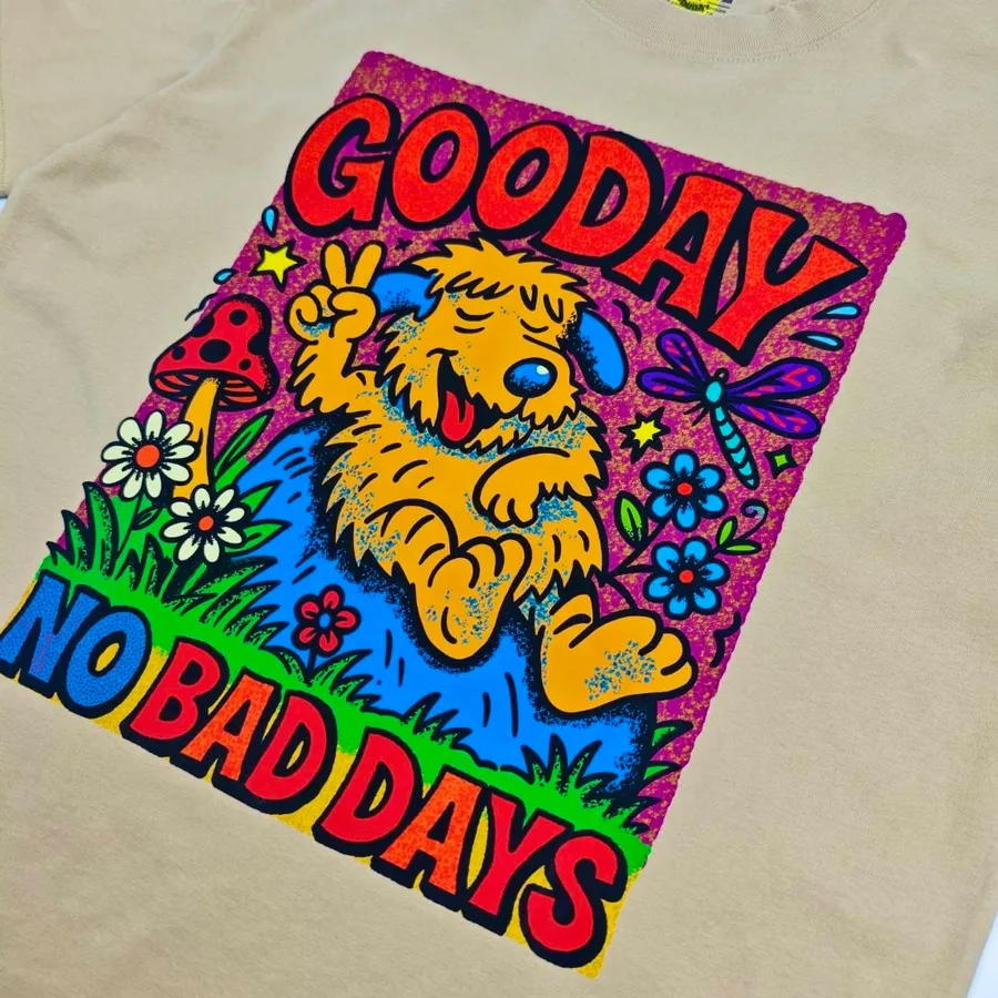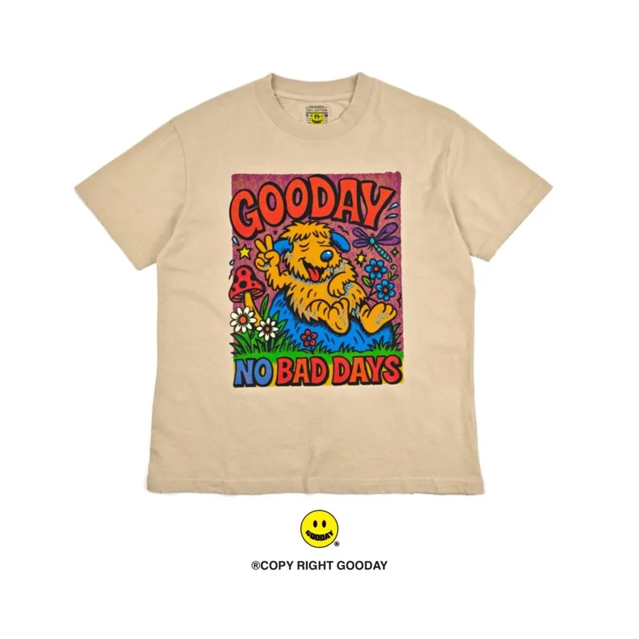 這款 GOODAY FLOWER TRIP PUP TEE,以經典口號「NO BAD DAYS」為主題,結合手繪風格插畫,展現出品牌一貫的樂觀精神與輕鬆態度。