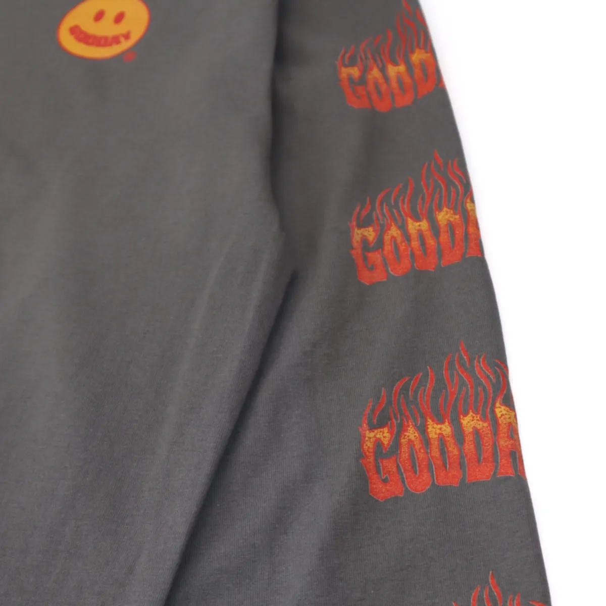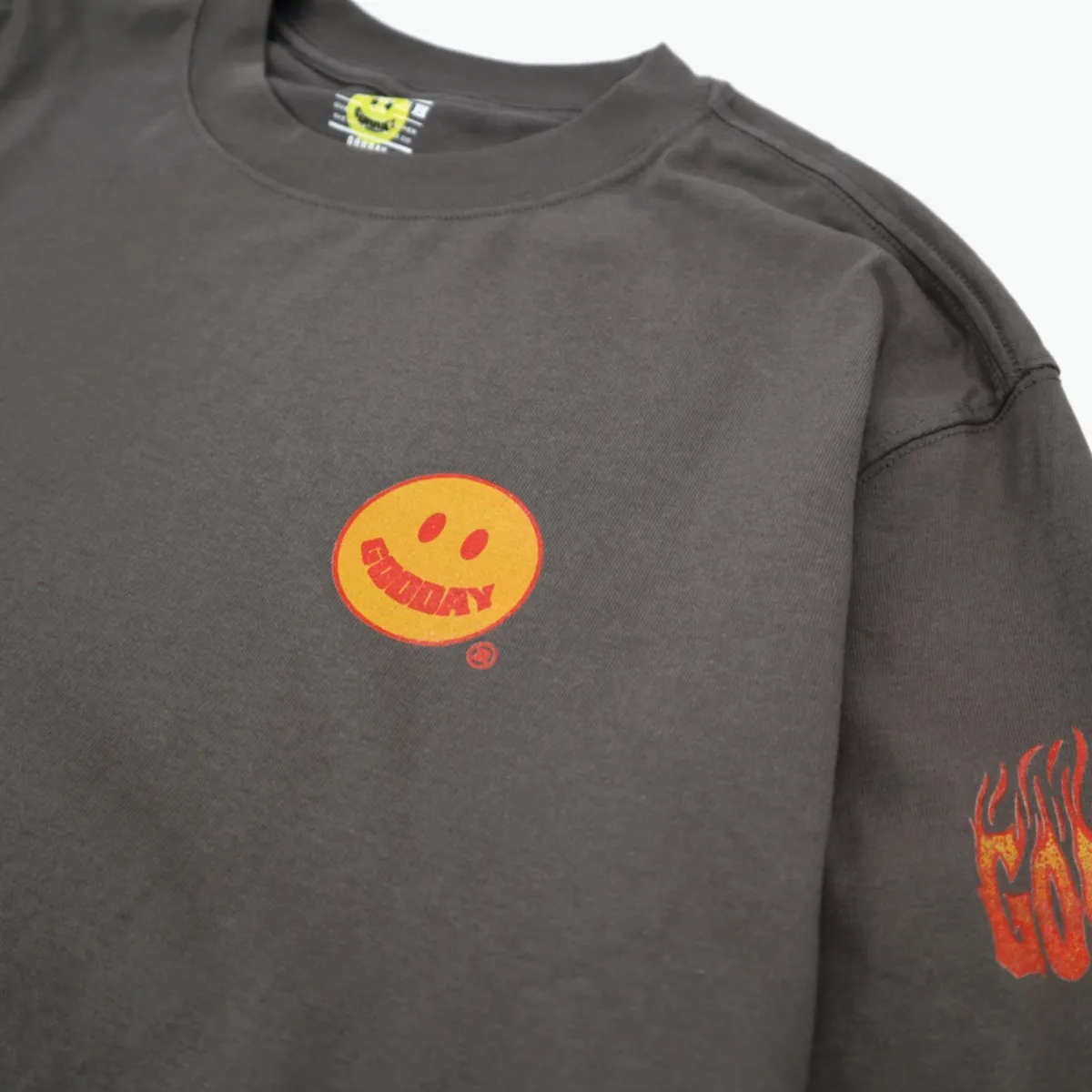 胸前配置經典 GOODAY 微笑標誌,袖身則以重複排列的 Flame GOODAY 字樣延伸視覺張力,低調卻充滿態度。